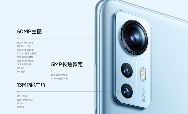 小米12:后置支持5000万主摄+ 1300万超广角+ 500万长焦微距,前置3200万像素,拍照模式下变焦倍率为0.6-10 倍,视频录制模式下倍率为 0.6- 6 倍,1X以上全部为数码变焦,仅0.6X和1X为光学变焦。
