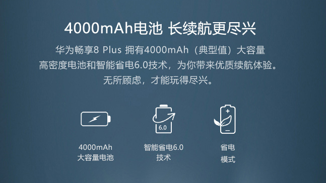 华为畅享8 Plus不仅配置4000mAh(典型值)大容量高密度电池,还有智能省电6.0技术,为你带来优质续航体验,在充电测试中我们发现仅需3小时即可完成充电。