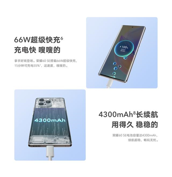 在续航体验方面,荣耀60SE为4300mAh,荣耀60为4800mAh,所以荣耀60能够带来更持久的续航。