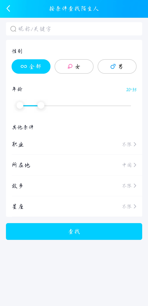1、精确查找是按照条件进行筛选,根据自己的需求来筛选好友,对所在地、年龄、性别、是否在线等筛选条件进行过滤查找和添加好友。