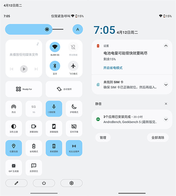 首先我们来看一下MYUI 3.0的下拉通知栏,其并不只是简单的开关聚合,而是将通知、控制、快捷开关等进行整合。通知中心和控制中心相互区隔,各个功能分区互不干扰,不会显得十分臃肿,干净利落的同时也是充分利用了下拉通知栏的空间。