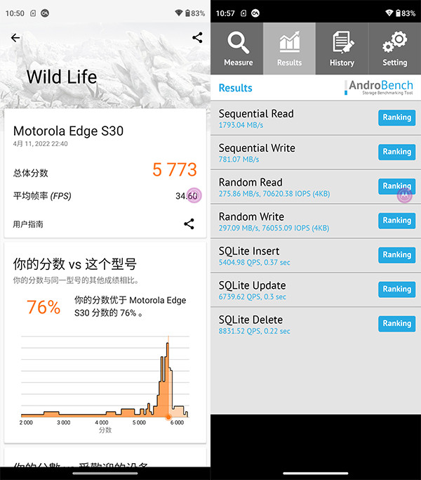 骁龙888+及Turbo LPDDR5内存和Turbo UFS 3.1闪存这一组“性能三件套”,使得S30冠军版拥有堪称越级的硬件实力,性价比方面确实拿捏得稳。跑分软件实测成绩如下:
