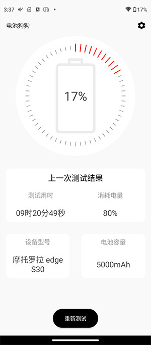 moto S30冠军版拥有一块5000mAh的大电池。据笔者用电池狗狗App做的日常模拟续航测试数据显示,经过9小时20分的使用,手机耗电量为80%。相比其他4500-5000mAh的机型,续航时间要长了一个多小时,整体表现还是非常不错的。