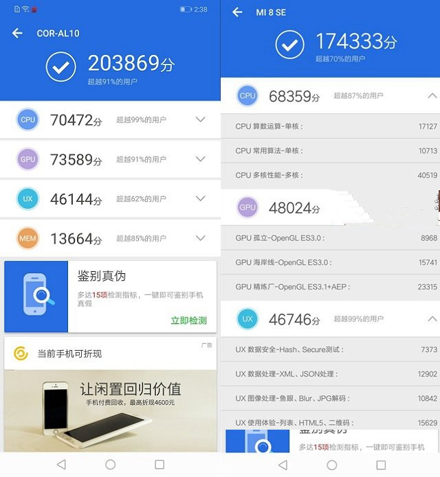 从参数对比来看,这两款CPU都是基于目前最先进的10nm制程,功耗都比较低,不过在CPU、GPU等方面都不同,下面我们直接来看看这两款手机的安兔兔跑分对比。