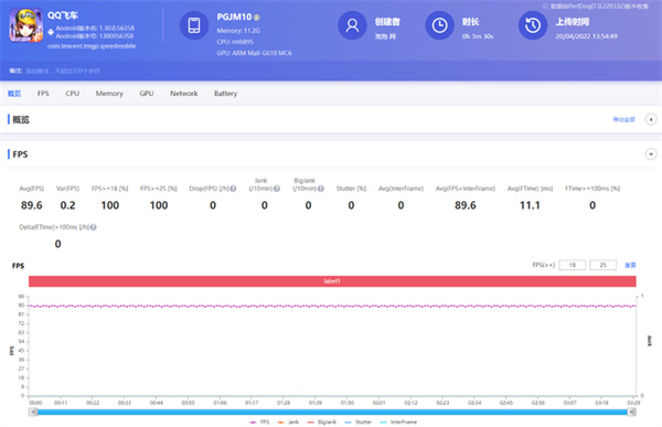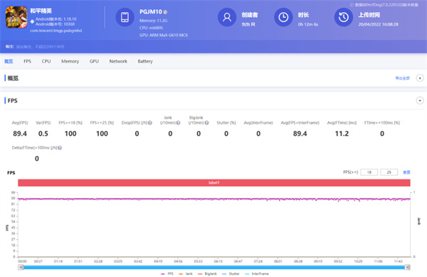 《和平精英》在流畅画质下支持90帧高帧模式,PerfDog软件记录到的平均帧数为89.4帧。无论是开车或者对战场景,游戏帧数波动都很小,基本在90帧左右,画面流畅度很好。