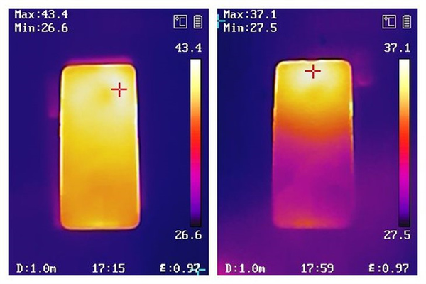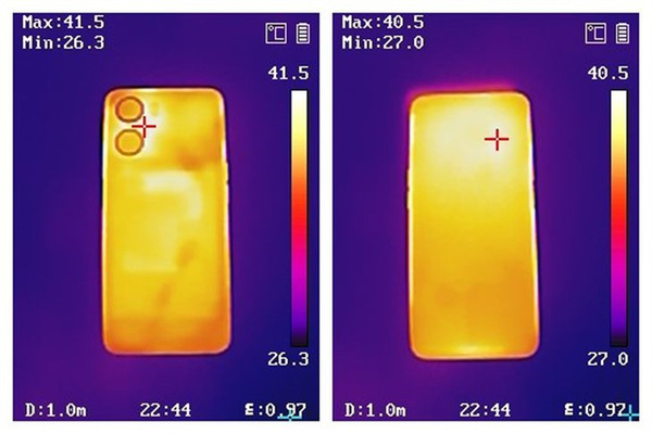 温度方面,在约26度的环境,玩30分钟90帧《和平精英》游戏后,测得背面最高温度为41.5度,正面最高温度40.5度。机身温度控制得非常好,30分钟游戏后握感仍旧比较舒适。值得一提的是,机身一体化的后盖设计降低了摄像头模组的硌手感,在横向握持玩游戏场景很容易感受到。