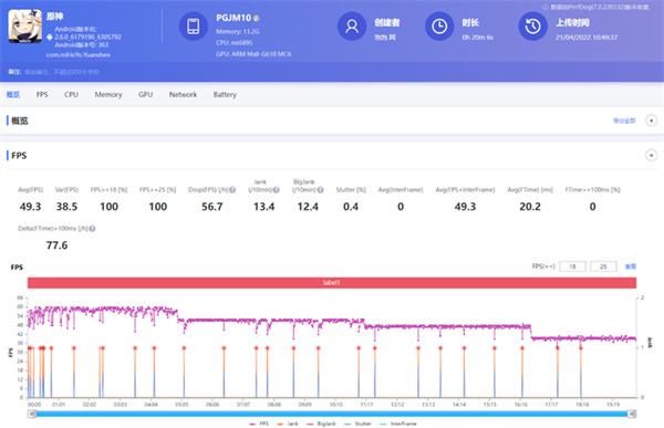极高画质+60帧的设置下,在负载特别高的璃月港游戏场景进行跑图测试,20分钟游戏后,PerfDog软件记录到的平均帧数为49.3帧。从帧率曲线图可以看到,手机为阶梯式帧数限制,前面10分钟左右基本都能保持在50帧以上,画面流畅度比较好。后面虽然帧数做了进一步限制,但帧数波动控制得不错,仍可以提供较为流畅的游戏体验。