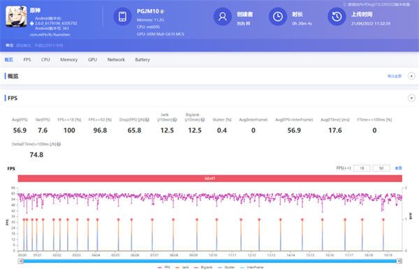 同样是约26度的环境下,20分钟游戏后,PerfDog软件记录到的平均帧数为56.9帧,相比没有散热背夹的平均49.3帧提升不少。加上散热背夹后,全程性能释放都比较激进,即使到后期,仍旧能保证很好的流畅度,没有出现锁帧的现象。