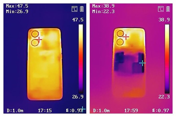 温度方面,裸机和使用散热背夹的测试场景一致,均为极高画质+60帧画面设置,玩20分钟游戏。裸机测试场景,背面最高温度为47.5度,正面最高温度为43.4度。增加了散热背夹后,背面最高温度只有38.9度,正面最高温度37.1度。在散热背夹加持下,机身正面和背面温度都有大幅下降,能够保持舒适的握持感。如果你经常玩高负载游戏,加个散热背夹能让体验变得更好。