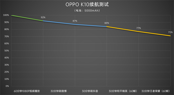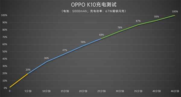 OPPO K10内置5000mAh大电池,支持67W超级闪充,拥有智能五芯保护,搭载OPPO独家电池智能健康引擎。这样的组合在对应价位段中很有竞争力,充电续航实际表现如下。