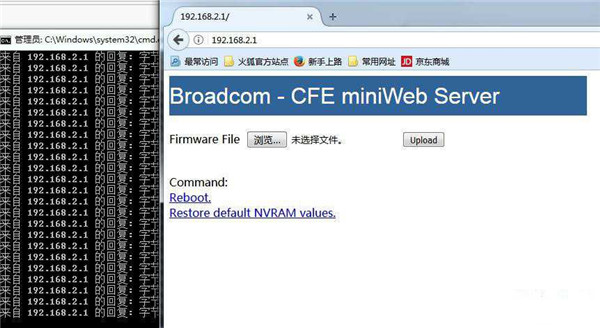 如果网页是无法打开的页面,可以关路由重来。为了方面掌握时间,开了cmd窗口,ping 192.168.2.1 -t。当出现ttl值为100时用浏览器就能进入192.168.2.1的CFE界面。