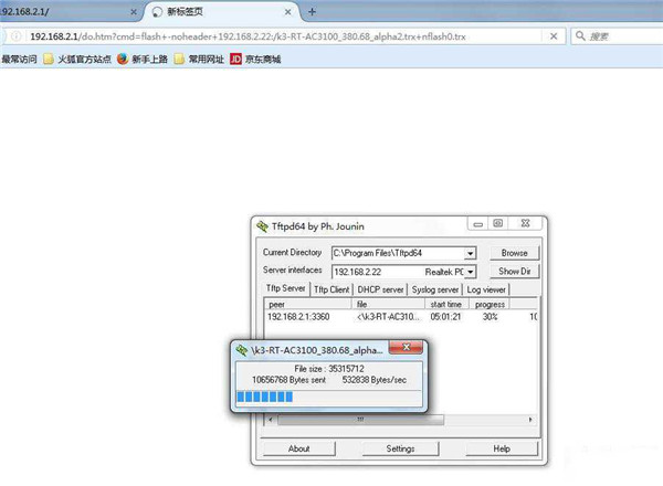 C:\Program Files\Tftpd64这个目录,是放要刷的梅林固件的目录,你也可以把固件放在其它地方,设置一下固件所在的目录就行。下方的192.168.2.22就是电脑网卡的IP地址,选择一下便行。设置好这2个地方后,就在浏览器地址栏输入下面的地址:http://192.168.2.1/do.htm?cmd=flash+-noheader+192.168.2.22:/k3-RT-AC3100_380.68_alpha2.trx+nflash0.trx按回车键就开始刷入,TFTP也有反应。如下图: