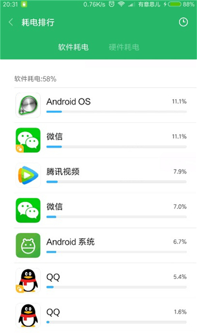 利用安全中心的耗电排行榜检测,硬件耗电“大户”当属于手机屏幕,屏幕占据硬件耗电的39.7%,几乎都是它产生的。因此,米粉用户能手动调试屏幕亮度来节省电量。