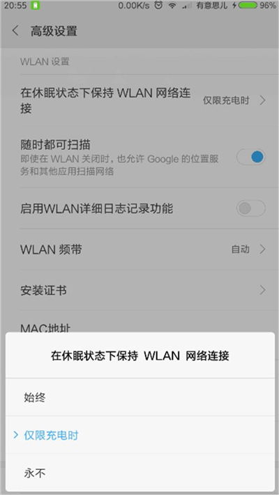 操作步骤:设置--WLAN--高级设置--休眠状态下保持Wlan网络连接,选择“仅限充电时”。尽管不能完全对节省电量有很大影响,但长期规律摸索依然存在不小作用。