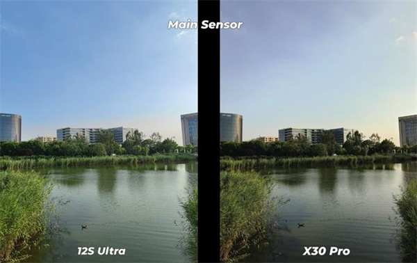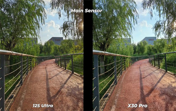 首先是白天主摄拍照对比,在这种逆光环境下,右边Moto X30 Pro整体画面亮度更高,远近景的细节更清晰。而左边小米12S Ultra画面略显昏暗。