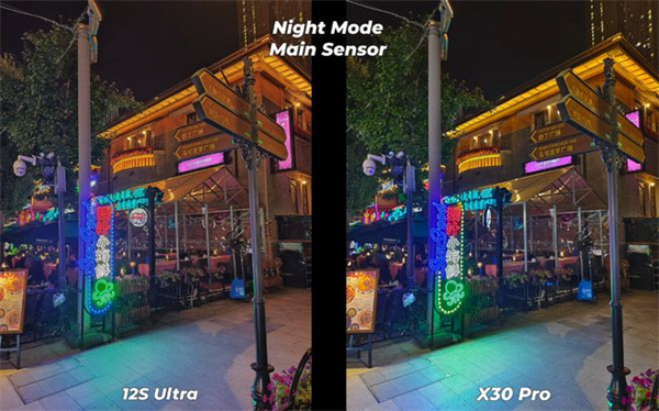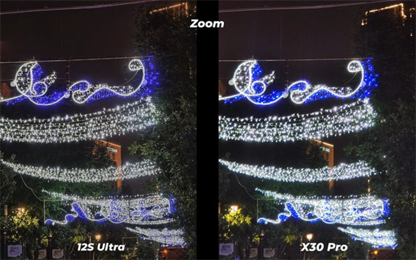 夜景长焦拍照对比,赢家是谁我想大家一目了然吧?很显然,左边小米12S Ultra画面更优秀,高光压制到位,细节相当丰富,不管是近景高光还是远景高光,整个画面质量都非常在线!而Moto X30 Pro的表现差了不少。