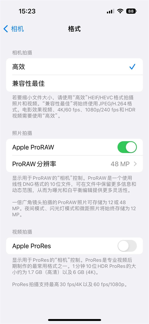 但是,我在拍摄界面并没有找到4800万像素的开关,直到进入设置菜单,才在相机-格式-照片拍摄里打开Apple ProRAW格式之后,才能将分辨率设置为48MP。也就是说,只有用Apple ProRAW格式拍摄的照片,才是4800万像素。