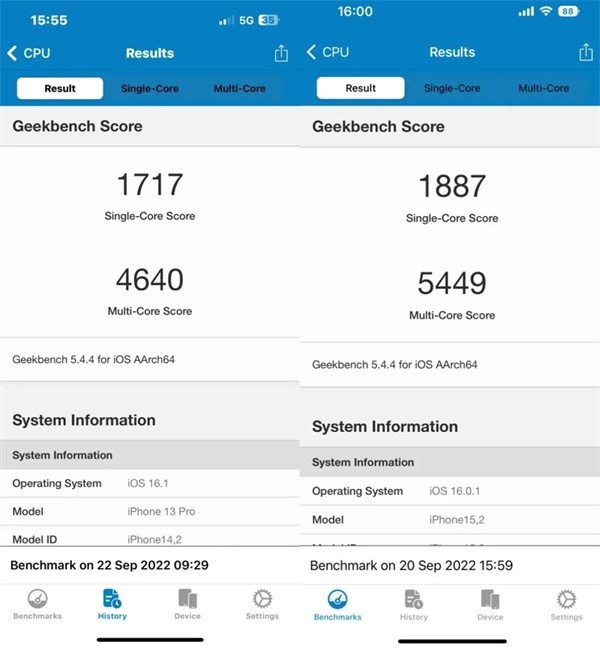 表面上看,A16相比A15性能也就提升了10%,并不夸张。通过Geekbench 5的测试也可以看到,iPhone 13 Pro单核成绩1717,多核4640;iPhone 14 Pro则是单核1887,多核5449,的确都在10%左右。