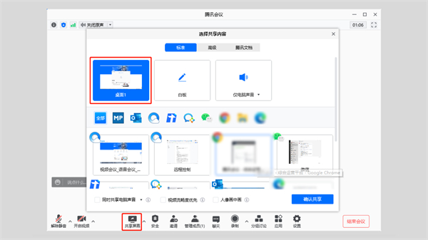 1、进入会议后,被控用户选择共享屏幕,在选择共享内容中共享某个桌面。
