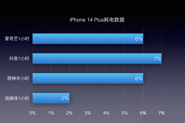 屏幕增大后,iPhone 14 Plus的内部有了更多的空间,这也为长续航提供了更多可能。我们针对不同场景进行了实测,使用iPhone 14 Plus看一小时流媒体视频耗电量为6%,刷一小时短视频耗电量为7%,玩半小时高画质《原神》耗电6%。这部屏幕更大的手机,足以保证重度用户的使用。