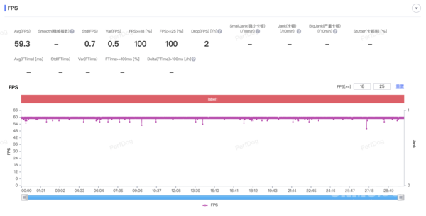 我们实测了60帧高画质《原神》,使用iPhone 14 Plus运行半小时游戏后,机身背部最高温度43.3摄氏度,侧边框温度39.6摄氏度,摸上去并没有烫手的感觉。而通过帧率图也能看出,iPhone 14 Plus在运行游戏时,帧率表现同样相当稳定,半小时高画质《原神》平均帧率为59.3,没有出现明显的波动情况。