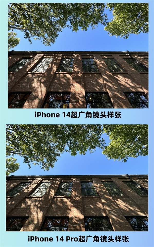 iPhone 14与iPhone 14 Pro的超广角镜头虽然都是1200万像素,但是规格并不一致,但是从成像效果来看iPhone 14与iPhone 14 Pro的超广角样张成像效果实际并没有明显差异,均能够呈现出优秀的光影效果。