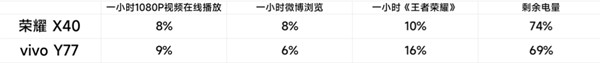 这两款芯片除了有应对日常使用的充沛性能,也有着不错的低功耗表现,这也赋予了我们今天对比的两台机子都不错的续航表现。就拿我们此前的评测数据来说,同样是一小时视频播放、微博浏览和《王者荣耀》游戏的续航测试,vivo Y77 会剩下 69% 的电量,荣耀 X40 则会剩下 74%,算下来都是非常优秀的续航了,荣耀略好一些。