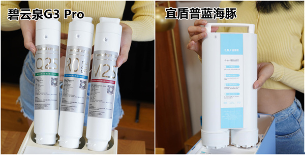 在废水方面,宜盾普蓝海豚的废水比为4:1,即过滤5L自来水,产出4L的纯净水+1L的废水,碧云泉G3 Pro为3:1,过滤4L自来水,产出3L的纯净水+1L的废水,,从后期使用的经济性来看,宜盾普蓝海豚显然要更加划算一些。