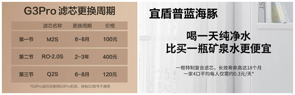 这里我们默认以它们的最长使用时间来计算,G3 Pro三年的滤芯成本为1600元,折合每年530元,而宜盾普这边三年需要更换两次滤芯,共计1400元折合每年466元。