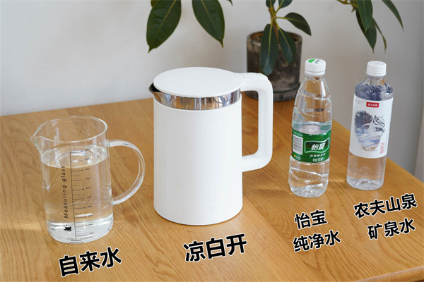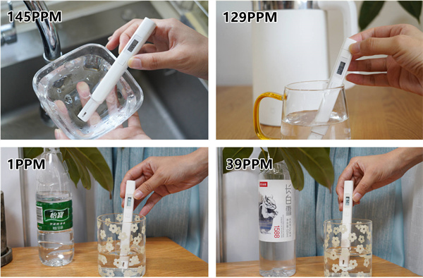 为了方便直观的进行对比,我首先对家里常见的四种水质用TDS检测笔进行检测,它们分别是自来水,煮熟的凉白开,怡宝的纯净水,以及农夫山泉的天然矿泉水。