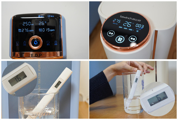 再来看看两款净饮机的表现,碧云泉G3 Pro屏幕上显示净化前和净化后的TDS分别为275ppm和3ppm,实际测得的TDS值为6ppm,而宜盾普蓝海豚屏幕上显示净化前和净化后的TDS分别为276ppm和19ppm,实际测得的数值为16ppm,从结果来看两款净饮机的实际净化效果都十分优秀,实际测试的数值与机身显示的数值也都十分接近,净化后的自来水TDS值大幅降低,均能够达到直饮标准。