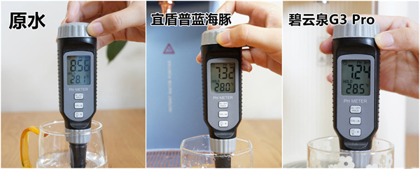 两款净饮机在对自来水净化之后,PH值都有明显的下降,其中碧云泉G3 Pro为7.24,宜盾普蓝海豚为7.32,都呈现弱碱性,符合国家标准。