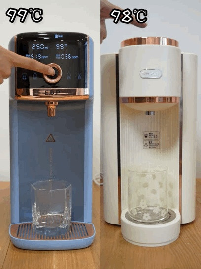两台净饮机的最大即热功率均为2200W,我分别测试了它们在最高水档的加热速度,从对比可以看到水温为99℃的宜盾普和98℃的碧云泉在按下出水键之后都能在1秒左右快速出水,反应都十分迅速,用肉眼很难看出差别。