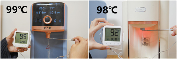至于实际制水的温度是否能够达标,我用温度计测试出水瞬间出水口的温度。在机身设置的最高水温下,宜盾普蓝海豚实际测得的温度为95℃,碧云泉G3 Pro实际测得的温度为92℃,两款净饮机的水温均符合国家标准最低的90℃。不过在水温的精确控温方面,宜盾普更有优势,考虑到热水进入水杯后热量还会进一步流失,平时喜欢泡红茶,喝咖啡的小伙伴就要选择一款上限更高,控温更加精准的净饮机了。