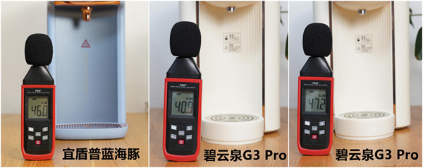 最后我还测试了两台净饮机在制水时的噪音,宜盾普蓝海豚从开始到结束,声音始终比较稳定,为46dB,碧云泉G3 Pro之所以有两个数值是因为起先它的声音比较发闷,噪音值也比较低,之后则会满满上升,不过好在两款净饮机的最大噪音量都不高,低于日常谈话时的声音,所以摆放在客厅或者书房都不会觉得吵。