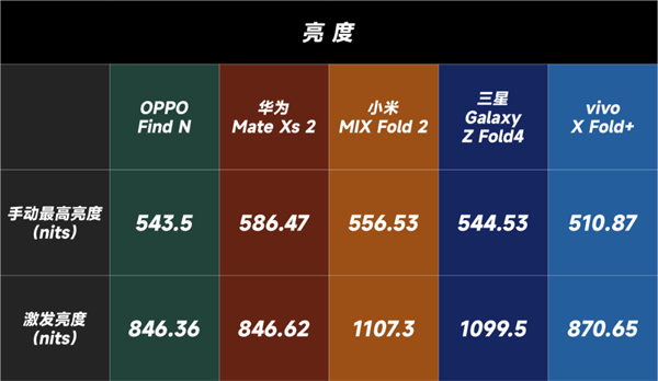 而外界强光激发下,华为 Mate Xs 2 的激发亮度来到 846.62nits,与三星 E4 基材的 OPPO Find N 相近,而三星 E5 基材的 vivo X Fold+ 会稍微亮些,达到 870.65nits;不过差距在三星的 Eco² 系列中被大大拉开了,小米的 MIX Fold 2 和三星 Galaxy Z Fold4 激发亮度已破千,来到了 1100nits 左右;而 Eco² 和最新的 Eco² Plus 亮度上的提升似乎并不明显,反映到实际机型甚至不到 10nits 的差距。
