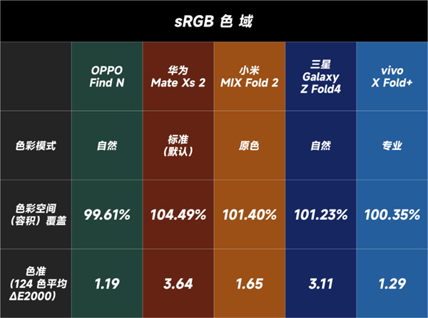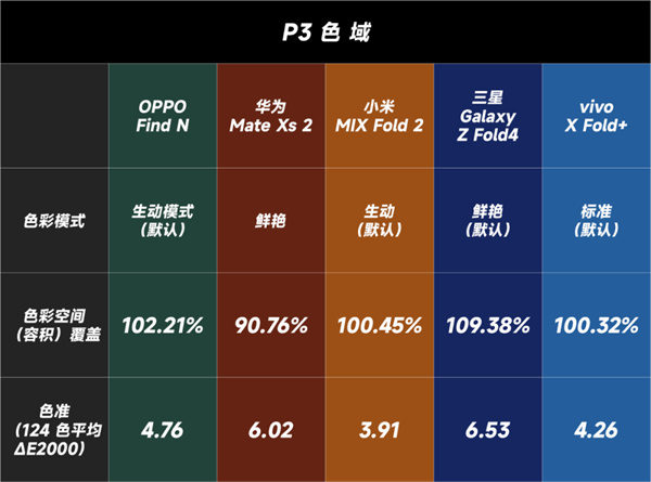 这五款手机里,OPPO 在 Find N 上展示了其深厚的色彩调教功力,综合来看是 5 款机子调得最准的,特别是在「自然」模式下测得的 sRGB 色域覆盖高达 99.61%,非常接近 100%,而反应色准的 ΔE 更是低至 1.19;默认的「生动」模式在 P3 标准色域下虽不是最突出的,但表现同样不俗。