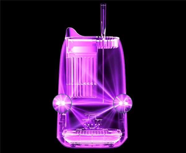 机身下部的电源键是唯一的一个实体触摸按键,触摸式操作很灵敏。按下电源键可以看到,机身内部的紫外线灯亮起,证明紫外线杀菌开始工作,权威机构认证其消毒杀菌率高达99.99%。这个双株uvc紫外线灯,波长为250-280纳米,不仅杀菌消毒能力强,而且更加安全。紫外线灯前面内置了两枚蓝色的指示灯,与工作时的紫外线灯发出的浅蓝色光线交相辉映。