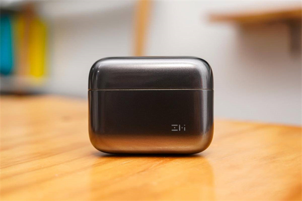 充电盒正面一览,整体是一个相对方正的圆角矩形,边缘过渡比较圆滑,握持手感温润;右下角设有紫米品牌 Logo,内置指示灯,用于提示设备状态。