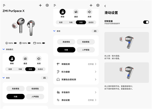 下载安装 ZMI hear APP 后,可查看设备连接状态和剩余电量,还可切换降噪模式、选择不同音效,以及进行其他自定义设置,其中滑动触控可以自定义开启 / 关闭。