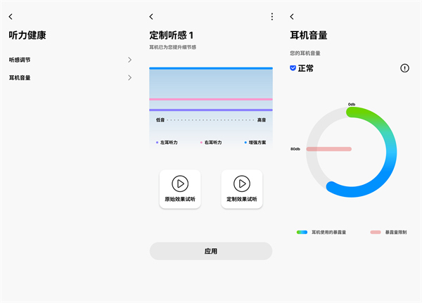 听力健康包含听感调节和耳机音量两项功能:听感调节通过检测算法,结合每个用户的耳道数据和听力特征,构建出专属声音模型,以定制听感获得更真实的声音;耳机音量,顾名思义则是限制过高音量,保护听力。