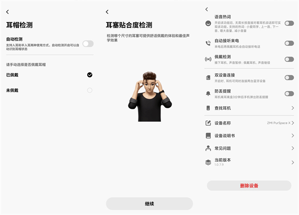 而考虑耳机需要在入耳和半入耳两种状态之间切换,耳帽检测功能会自动检测耳帽佩戴状态并开启对应的工作模式,例如调整降噪模式;耳塞贴合度检测也非常有必要,选择合适的耳塞尺寸对提升后续的佩戴、音质和降噪效果等方面都有帮助。