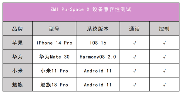 采用 4 款手机与 ZMI PurSpace X 进行连接兼容性测试,采用的手机分别是:iPhone 14 Pro、华为 Mate 30、小米 11 Pro 和魅族 18 Pro,设备包括最新机型和三年前发布的主流型号,系统涵盖了 iOS、安卓及鸿蒙平台。