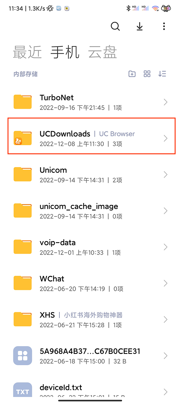 1、打开文件管理,点击手机,找到并点击UCdownloads文件夹。