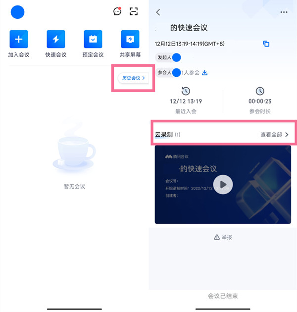 打开腾讯会议,点击右侧的历史会议,点击想要查看的会议,在云录制中即可查看。