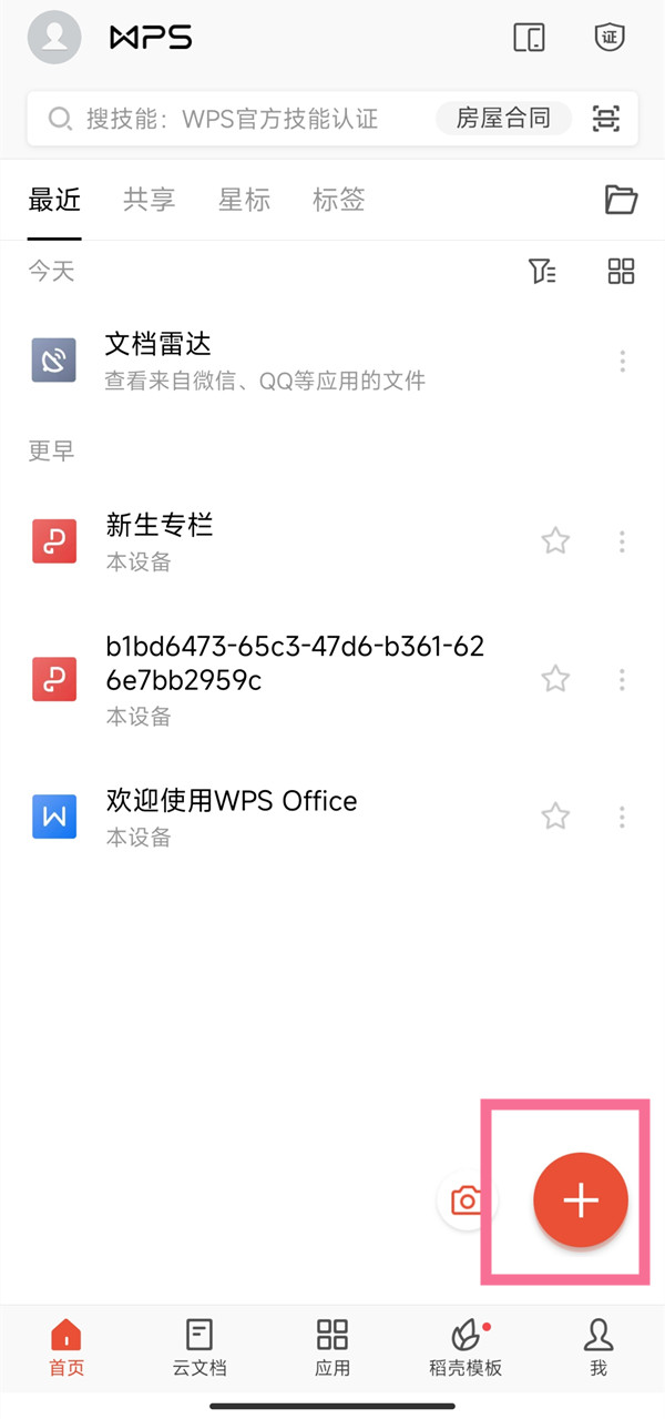 1、在手机上打开WPS Office软件,点击右下角的【+】。