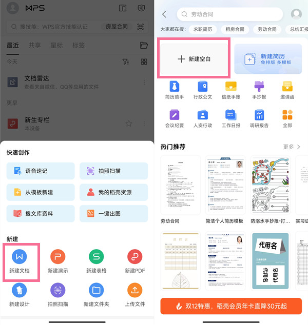 2、点击【新建文档】,点击【新建空白】即可做word文档。