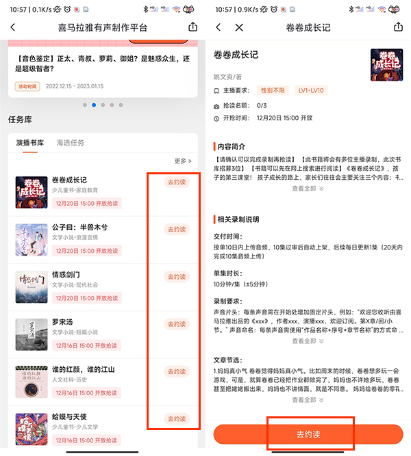 3、在任务库中选择自己感兴趣的任务,点击去约读,再次点击去约读即可。