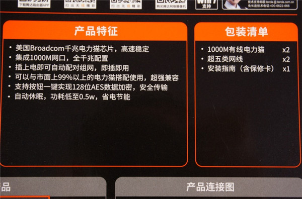 产品的特征介绍,采用了美国Broadcom千兆电力猫芯片,Broadcom Corporation (博通公司)(Nasdaq:BRCM)是全球领先的有线和无线通信半导体公司。包装清单写得也很详细,一般来说,电力猫是成双成对的,一个是无法正常使用的。