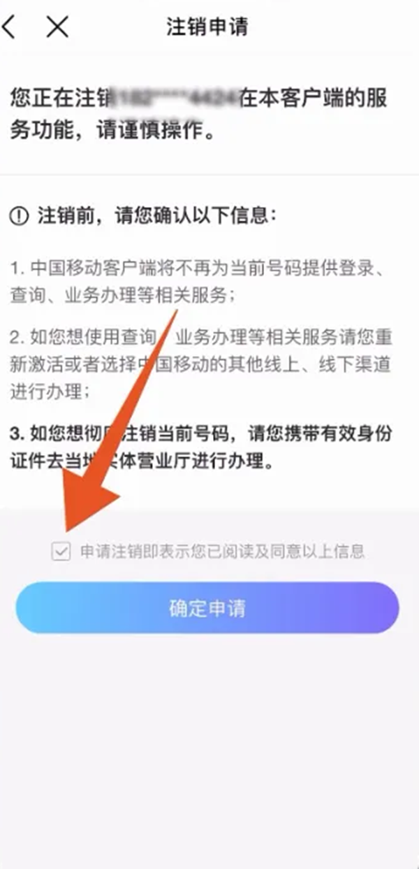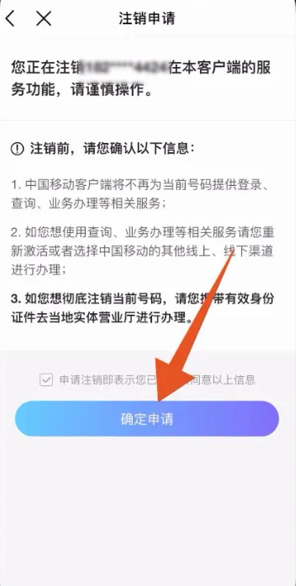 5、接着点击下方的确定申请,即可成功注销中国移动客户端的服务了。中国移动线上只能注销手机号的服务功能,如果想销号,只有到线下营业厅进行操作。
